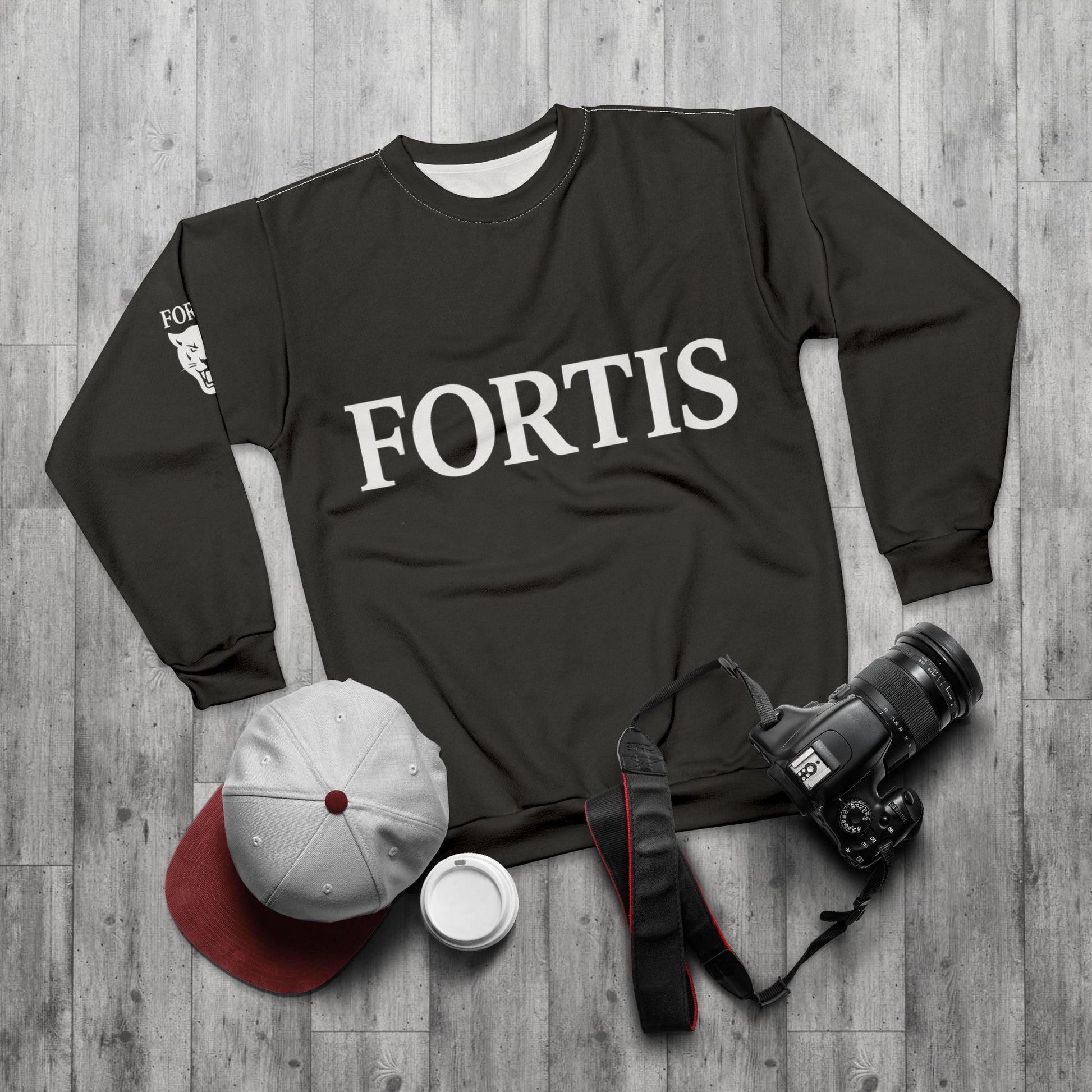 This classic crewneck sweatshirt reads strong and simple: “FORTIS” across the chest in crisp, timeless lettering. The all-over polyester print keeps the charcoal-black color deep and consistent, while white stitched details and a subtle emblem on the sleeve add quiet, purposeful accents. Wear it on cooler days when you want to feel grounded and confident—layered over a tee for a walk through the city or paired with joggers for station runs and morning training. The cut is relaxed without being boxy, so it moves with you whether you’re heading to rehearsals, practice, or downtime with close friends. There’s an understated, durable quality to this piece: built to keep its shape, stay vivid, and hold up to repeated wear so it becomes one of your steady rotation items.