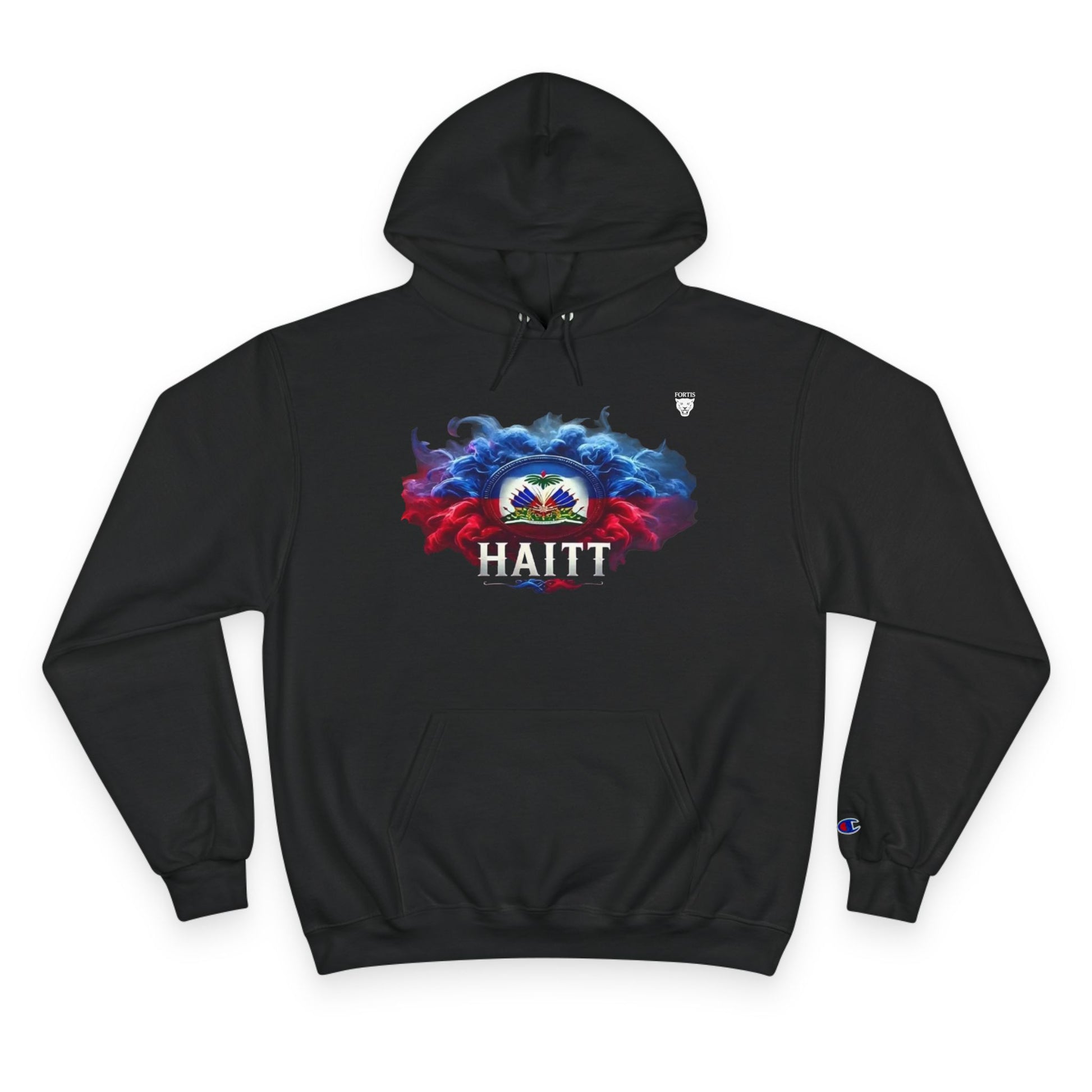 This hoodie carries more than warmth — it carries pride. A soft-black Champion hoodie features a vivid, smoky crest in Haiti’s flag colors over the chest, the word “HAITI” grounded beneath. The medium-heavy knit feels substantial without weighing you down. The roomy kangaroo pocket and adjustable two‑ply hood make it a go-to layer for cool mornings, late-night gatherings, or neighborhood walks. Subtle branding — the embroidered “C” on the sleeve — and a clean, seamless silhouette keep the look modern and wearable. Wear it when you want comfort that speaks to where you come from and what you stand for.