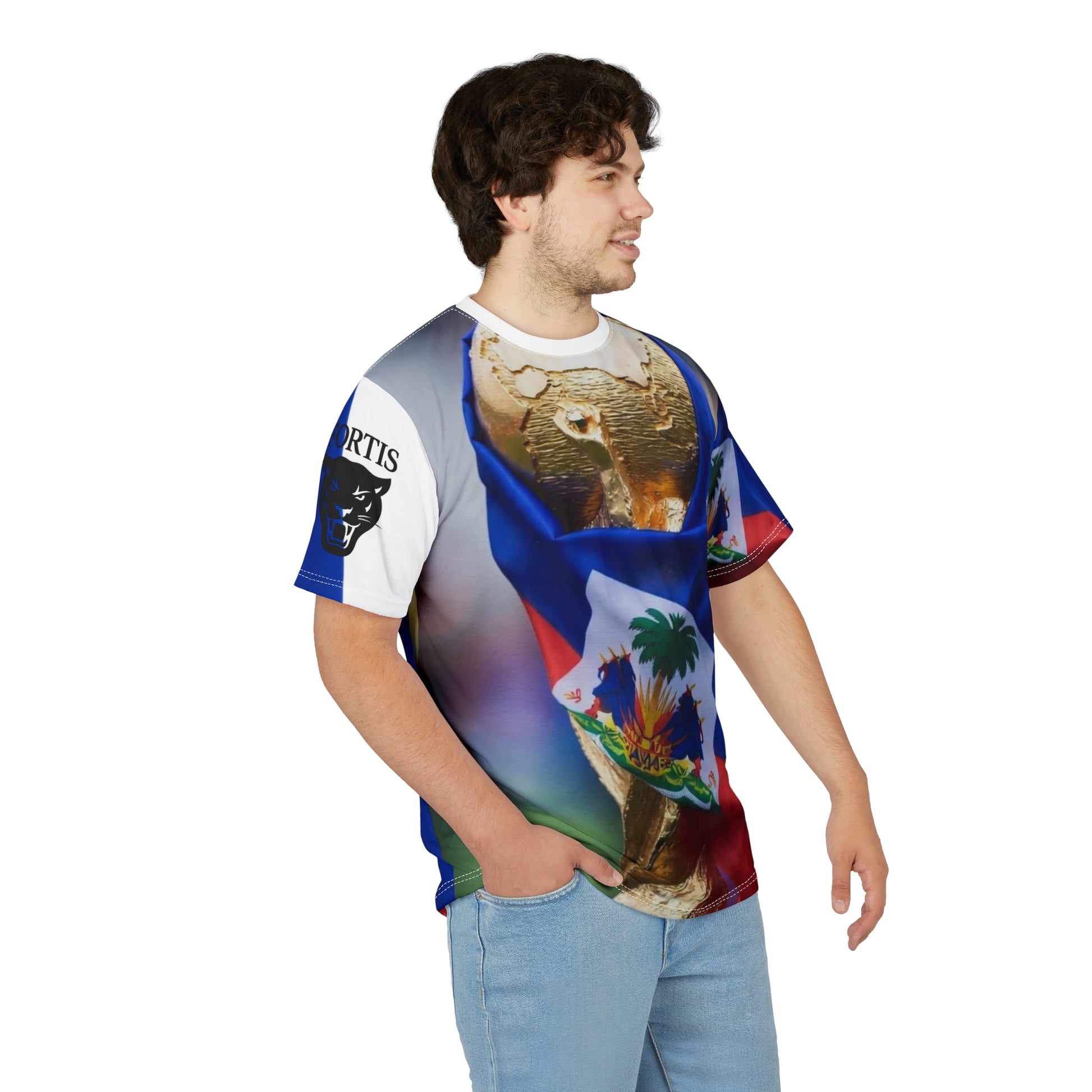 This all-over print tee carries a proud, vibrant energy—an athletic silhouette wrapped in bold national imagery. The design places a globe draped with a bright blue, red, and white flag front-and-center, so the shirt reads like a wearable banner: visible from every angle where you move. Lightweight yet structured, it keeps its shape while letting the printed colors pop. Wear it when you want to show visible pride at matches, rallies, or neighborhood gatherings. It sits well under a jacket or stands alone at outdoor events, and the tagless, soft-feeling finish keeps attention on the art rather than the label. The result is a statement piece that feels lived-in and authentic—comfort that carries imagery and memory with you.