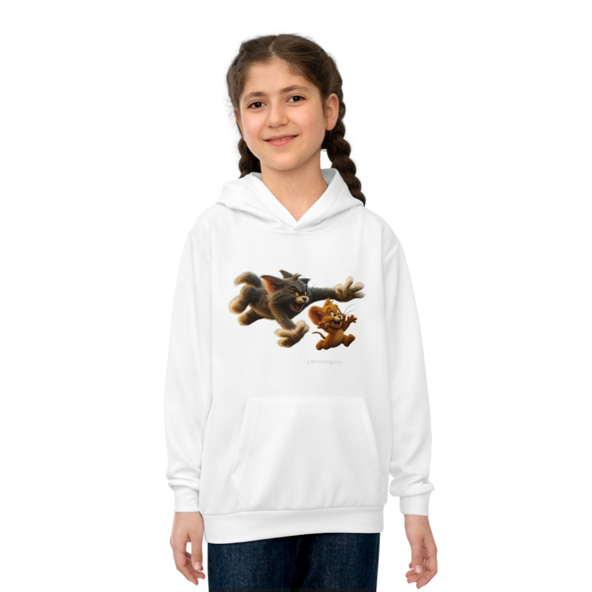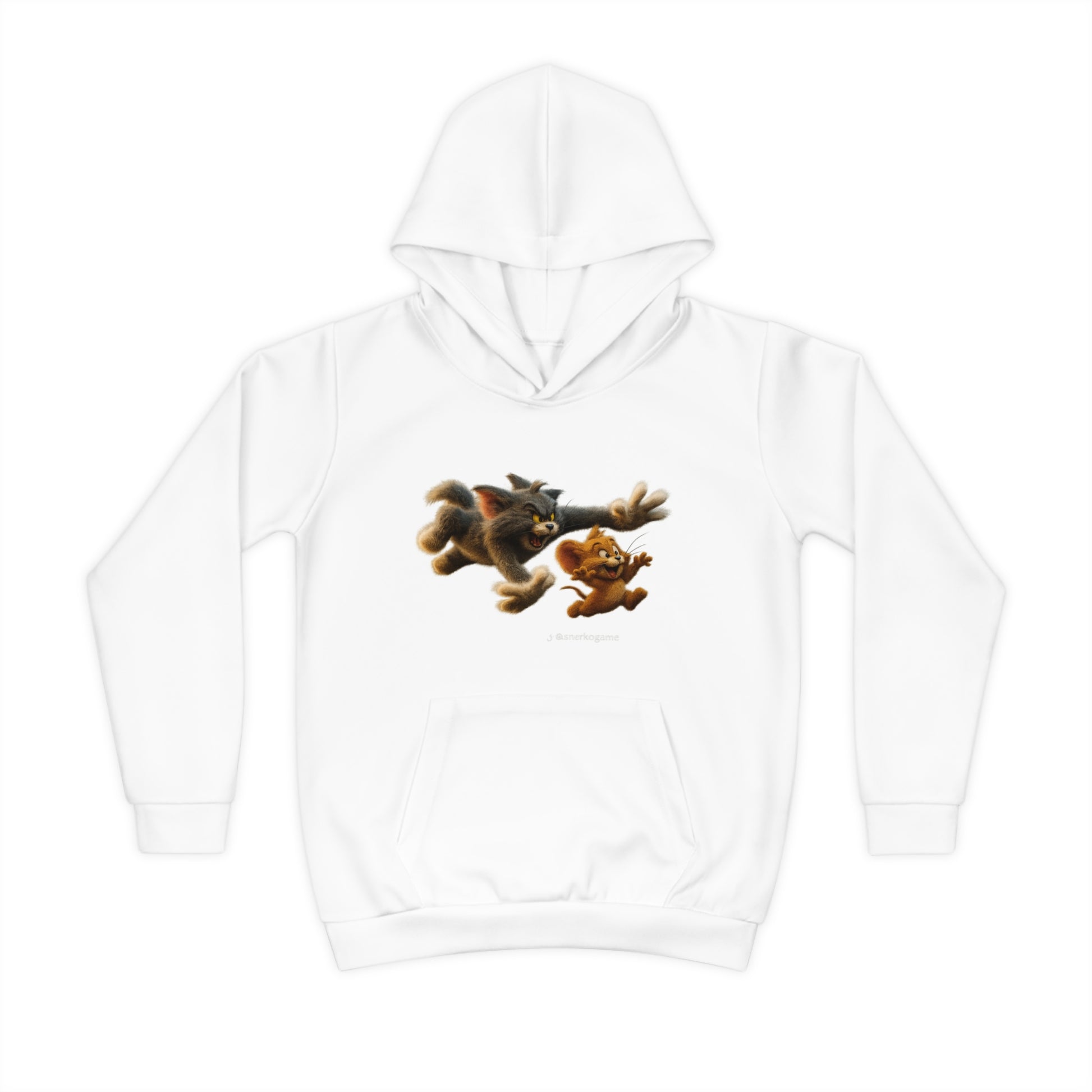 This cozy children’s hoodie brings playful energy to everyday wear. Made from a soft, slightly stretchy recycled polyester knit, it drapes light and warm for active little ones. The cute central artwork — a lively chase scene between two furry characters — adds movement and imagination to school days, playground adventures, or quiet story-time mornings. A roomy kangaroo pocket keeps small hands warm and stashes little treasures, while the double-layer hood adds extra comfort without the fuss of drawstrings. Thoughtful details like a custom inside waistband label and matched seam threads make it feel finished and special. Built for movement, comfort, and a bit of mischief.